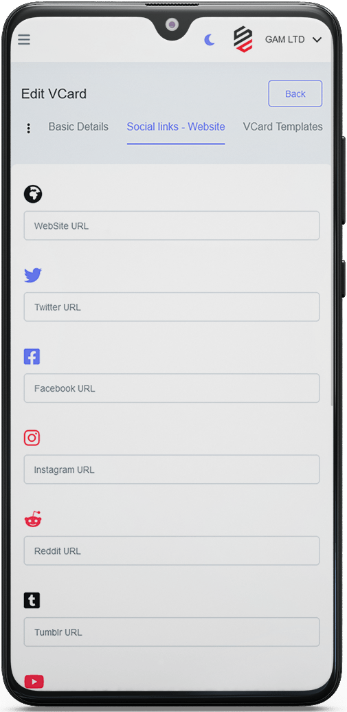 Users can add different social platforms links that will be later used to vcards preview. customers can see that links and use it for more information.
